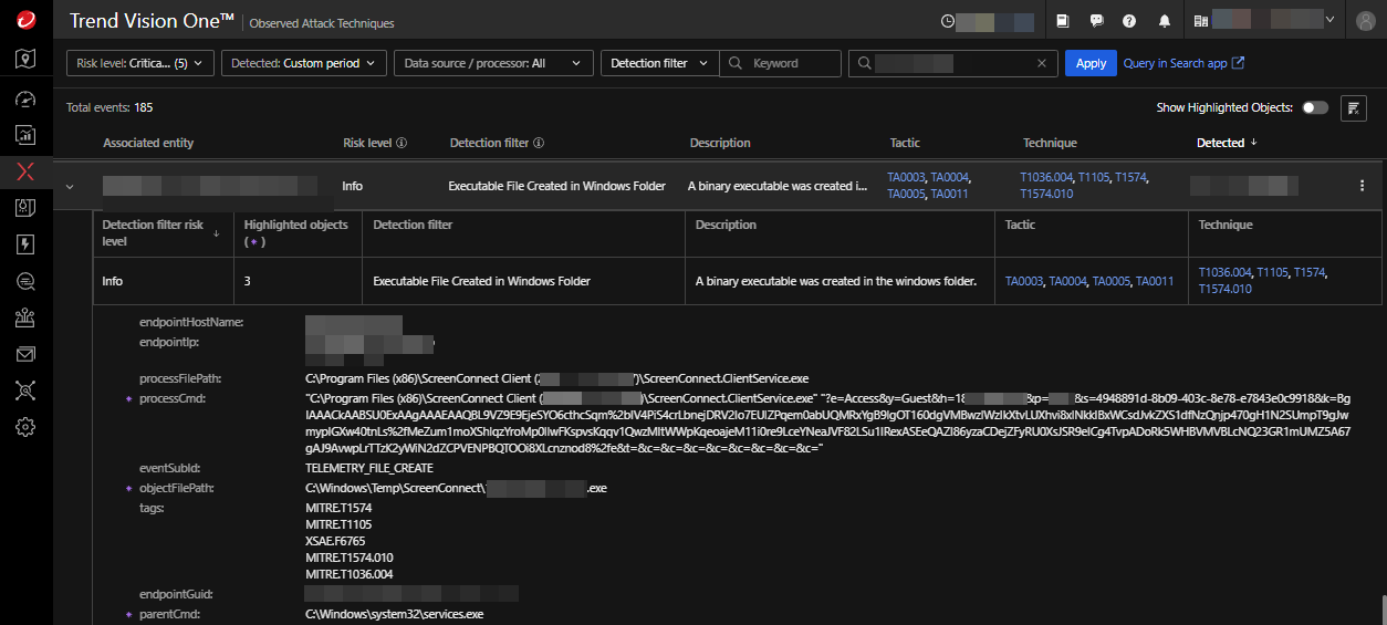 Tehdit avcılığı sürdürüldüğünde, sonradan devreye alınan Vision One ASRM kabiliyetinin getirdiği kolaylık sayesinde, başka bir danışman şirketin farklı iki istemciye uzak erişim için kurduğu ScreenConnect yazılımları tespit edilerek bu cihazların da ortamdan izole edilmesi sağlandı.